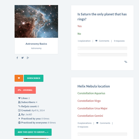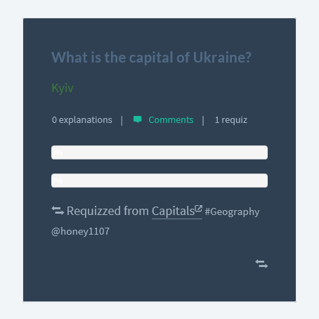 Now you can requiz questions from other quizzes to mention it in your quiz. Note, that you can not edit questions that is not created by you, but you still can add explanation and comment, and now, add and practice in your quiz. Another way to use 'Requiz' feature is to create quizzes from existing questions. That way quizzes can be much more flexible and there's no need to duplicate same question over and over.