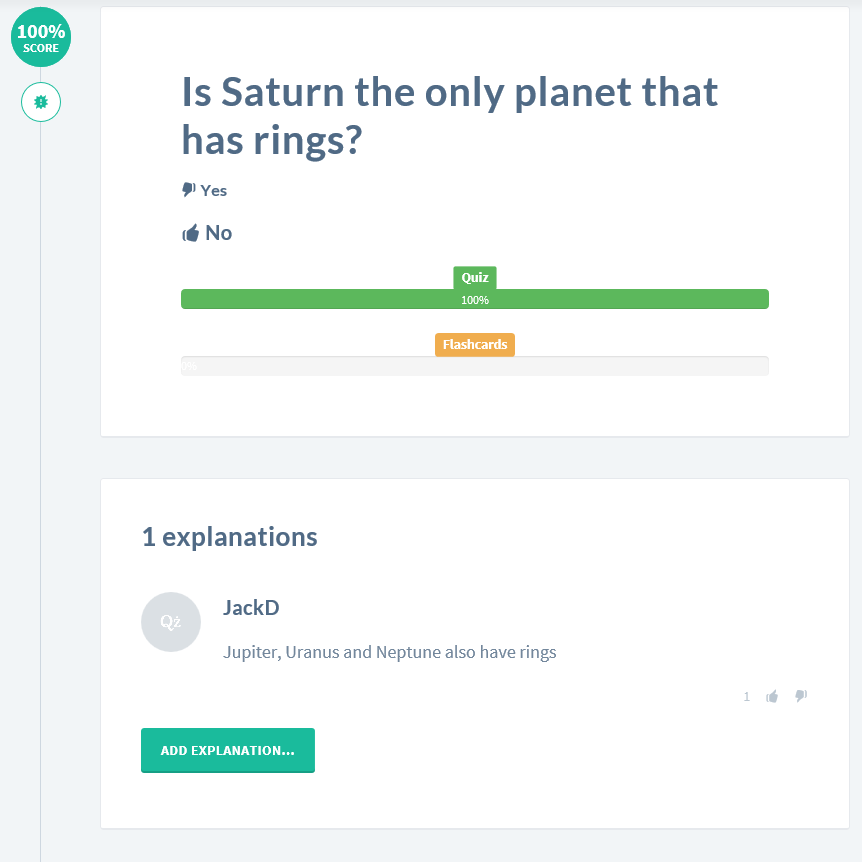 Add explanation or reference to any question. Not only it gives you more information, it creates an opportunity to study with others, since anyone can add an explanation to any question. Vote for the best to support it. Also, go through the explanations as you practice it in any mode.